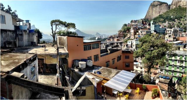 And here is the favela we are going to walk through. The Square Mountain at the back is Pedra da Gavea, climbed in article 28.