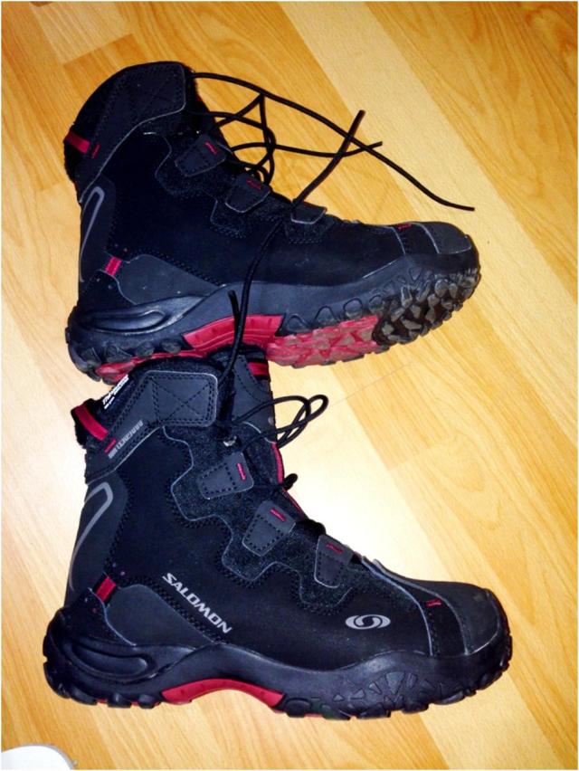 Took me a while to find good hiking shoes that could be used for the motorbike. Those are perfect: waterproof, warm, rigid and super comfy. They are made for the snow. Salomon.