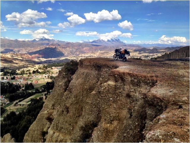 Behind the moto, Illimani, the second highest mountain in Bolivia (6,400m).