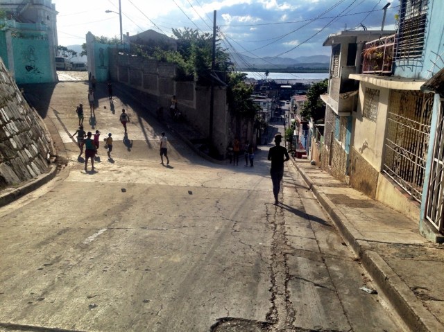 Kids playing football in steep streets: