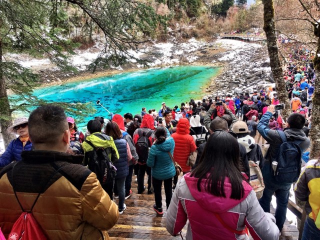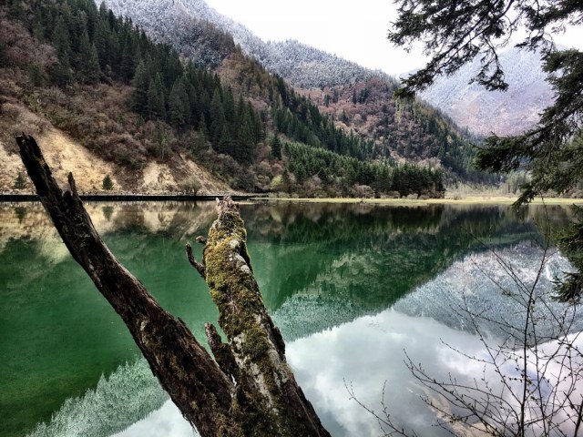 The 2nd day, however, the weather was better and we went to the Jiuzhai Valley park, a World Heritage site by Unesco. This natural gem is not known in Western countries, but it is a highly touristic place. It costs 45 USD to get in, and we were 2 of the 10,000 visitors this day (there are up to 50,000 visitors a day during the peak season!). And among everyone, I saw less than 5 Western tourists… Yes, there are a lot of visitors, but everything is very well organised: walking tracks, buses… We were not expecting to see snow! The nature was stunning, I was blown away. I still am, looking at these pictures: mix of colours, waterfalls, trees, mountains, lakes…